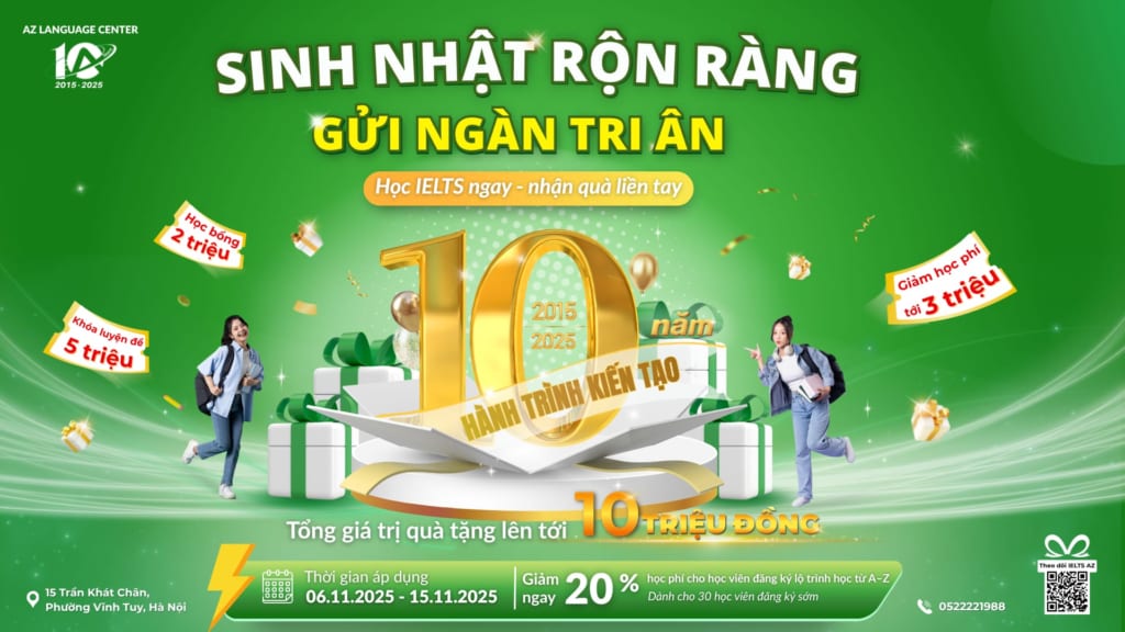 Vũ Minh Khoa – học viên AZ lớp C207 đã xuất sắc thi đạt chứng chỉ IELTS trong lần đầu tiên ( Listening 8.0, Reading 8.5 )
